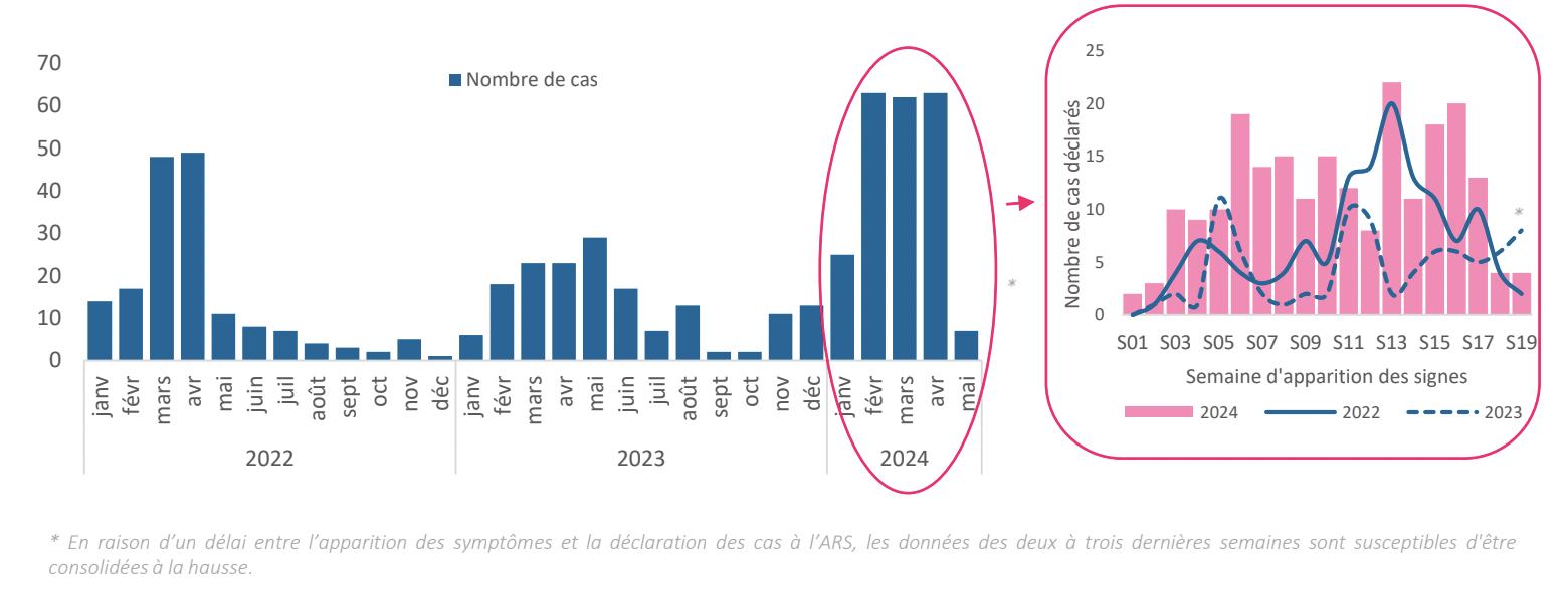 Après trois mois à un niveau élevé (avec plus de 60 cas mensuels déclarés) et sous réserve de consolidation des données, une tendance à la baisse semble se dessiner).