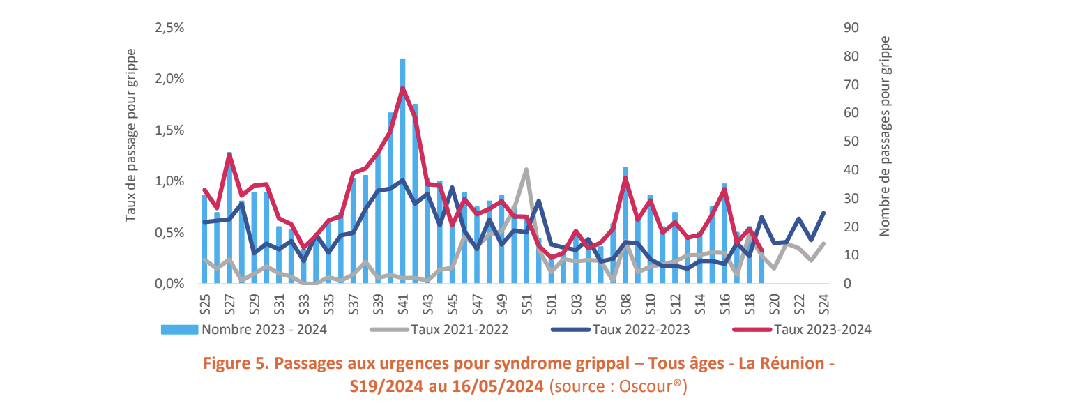 En S19, les passages aux urgences pour motif de syndrome grippal étaient en baisse. Les urgences ont enregistré 12 passages pour un motif de syndrome grippal en S19 contre 20 la semaine précédente. Le nombre d’hospitalisations pour syndrome grippal était stable avec 2 hospitalisations rapportées en S19 contre 4 en S18. La part d’activité des urgences pour un motif de grippe représentait moins de 1% de l’activité totale.