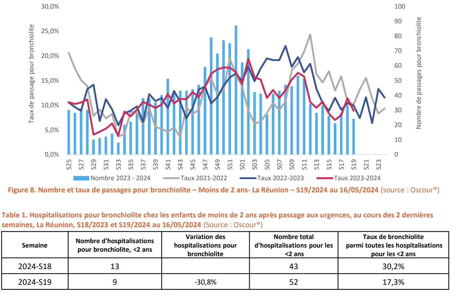 Concernant la surveillance virologique, le taux de positivité pour le VRS chez les moins de deux ans était en baisse, et se situait à 14% en S19 vs 31% en S18 avec une circulation uniquement de VRS de type A.