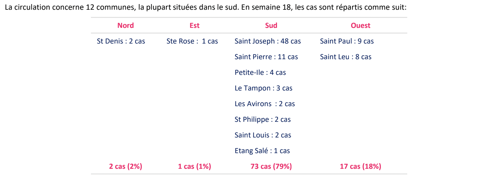 La part des cas signalés à St Joseph est en hausse, après plusieurs semaines de baisse ininterrompue. Elle totalise 52% des cas en S18 . La proportion de cas dans le Sud est stable (79%).