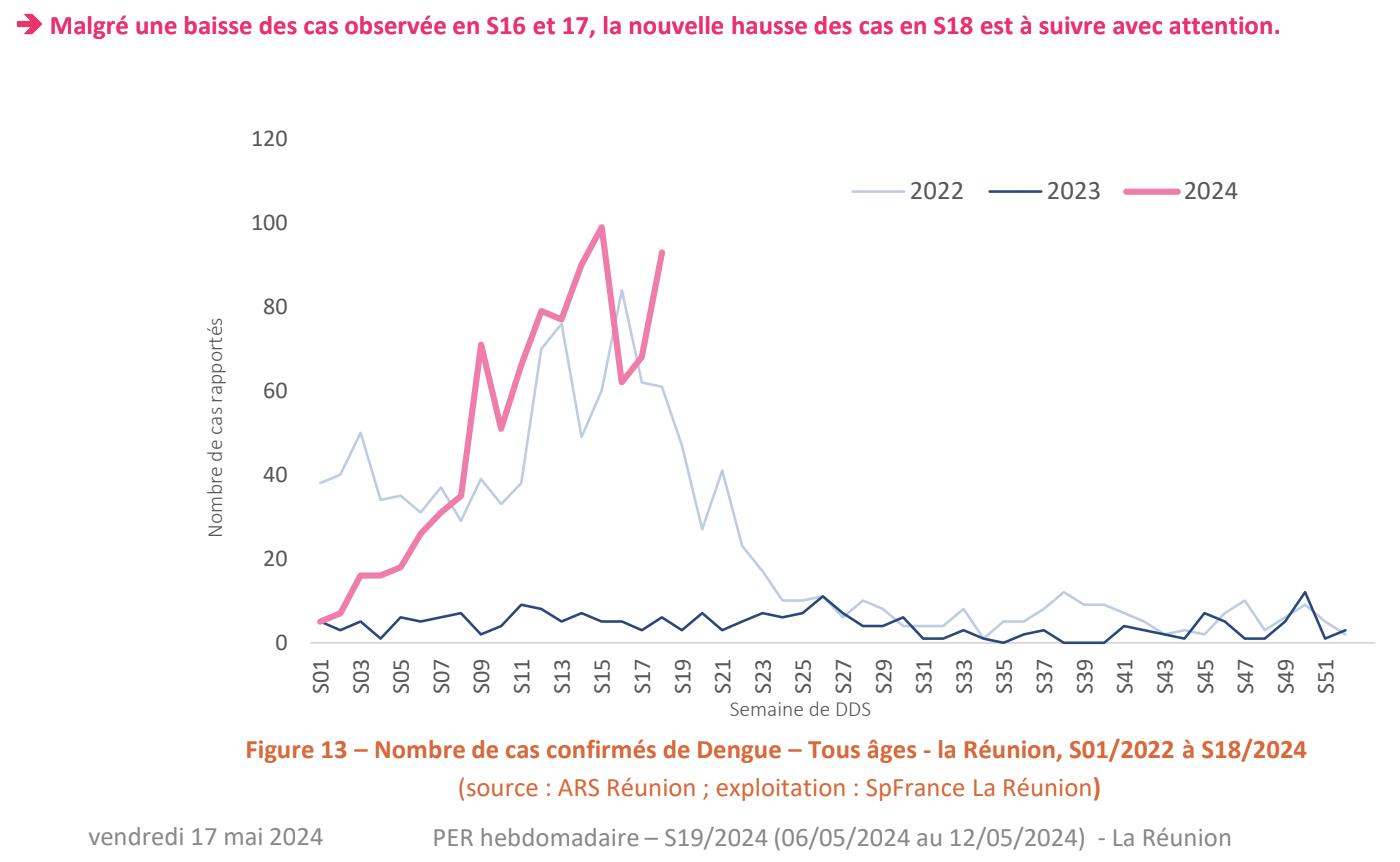 L’impact sanitaire reste à ce jour faible avec 125 passages aux urgences (CHU Sud et CHOR principalement) pour syndrome compatible avec la dengue depuis le début de l’année, dont 8 en S18 et 9 en S18. La grande majorité des passages aux urgences était signalée au CHU sud. L’impact hospitalier reste faible également avec 49 hospitalisations depuis le début de l’année, dont 12 en S14. Depuis le début de l’année, 2 décès directement liés à la dengue ont été signalé.