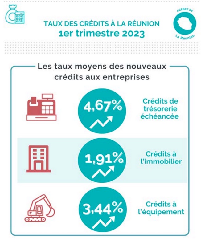 L’Institut d’émission des départements d’outre-mer a publié deux notes de conjoncture financière relatives aux taux des crédits à La Réunion pour les particuliers et les entreprises au 1er trimestre 2023. Le taux moyen des nouveaux prêts personnels et autres crédits échéancés à la consommation progresse de 63 points de base (pdb) entre le 4e trimestre 2022 et le 1er trimestre 2023. Désormais à 4,49 %, il reste inférieur de 49 pdb à celui observé en France entière. Côté entreprises, le taux d’intérêt moyen pour les nouveaux crédits à l’équipement s’accroît de 86 points de base (pdb) entre octobre 2022 et janvier 2023 (+91 pdb en France entière). Nous publions le communiqué de l'IEDOM ci-dessous.