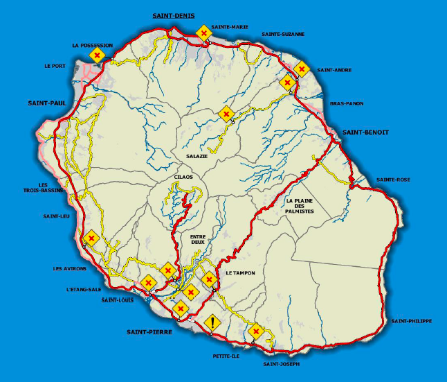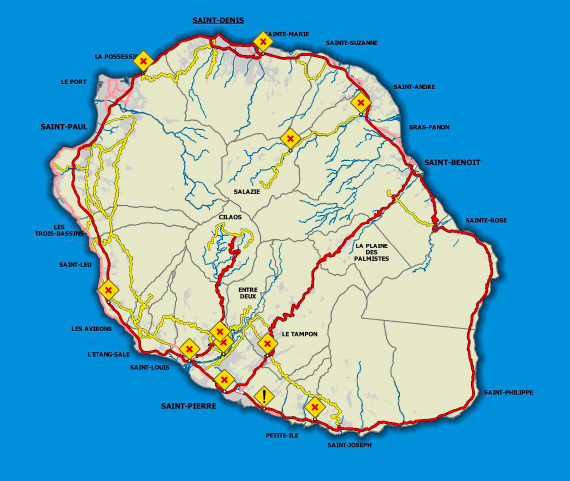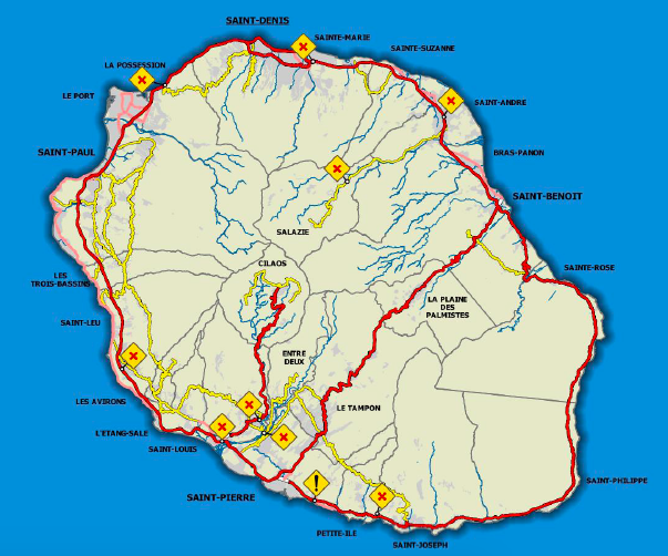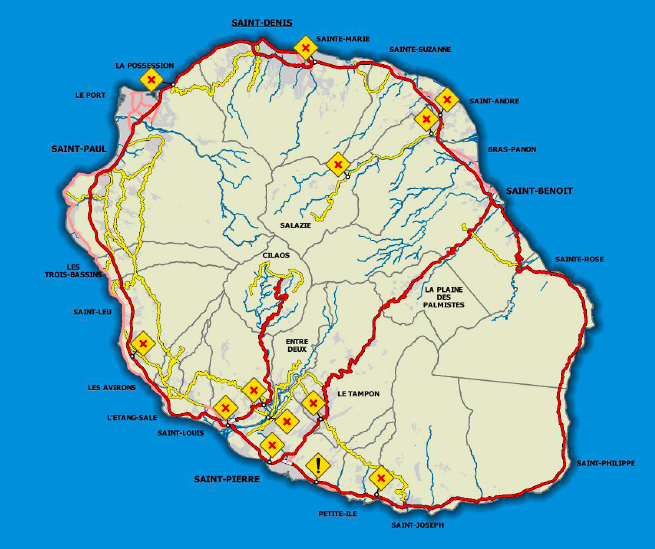 Sainte-Marie, Saint-Paul, La Possession, Saint-Benoit, Saint-Leu, Saint-André, Le Tampon, Saint-Pierre, Saint-Louis, Bras-Panon, Saint-Denis