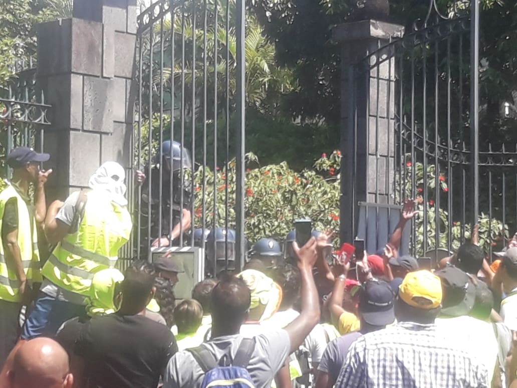 Devant la sous-prefecture de Saint-Pierre, des tensions apparaissent entre forces de l'ordre et manifestants. Un important dispositif est déployé devant alors que la ministre s'entretient avec des Gilets Jaunes
