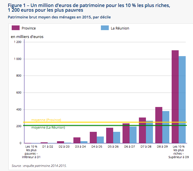 Le constat de l'Insee sur le patrimoine à La Réunion dresse un constat alarmant, voici l'étude de l'Institut de la statistique : Les inégalités entre les plus bas et les plus hauts patrimoines sont fortes : à La Réunion les 10 % les plus pauvres possèdent 1 200 euros de patrimoine en moyenne contre 1 million d'euros pour les 10% les plus riches. Les ménages à faible patrimoine sont particulièrement nombreux, tandis que ceux ayant un patrimoine élevé sont presque aussi riches qu'en métropole hors Île-de-France. Les 40 % les plus modestes ont ainsi trois fois moins de patrimoine qu'en province : 9 000 euros en moyenne contre 27 000 euros. En revanche, les plus aisés y sont presque aussi riches qu'ailleurs. Les 10 % les plus riches détiennent la moitié du patrimoine, alors que les 40 % des Réunionnais les plus modestes n'en détiennent que 2 %. Ces inégalités de patrimoine proviennent essentiellement d'un accès inégal à la propriété. Le patrimoine immobilier des cadres et des indépendants est ainsi trois à sept fois plus élevé que celui des ouvriers, des employés et des personnes n'ayant jamais travaillé, un écart qui s'est creusé depuis 2010. Avec une population plus jeune, moins qualifiée et moins souvent en emploi, les Réunionnais ont un patrimoine plus faible qu'en province : la moitié des ménages réunionnais disposent d'un patrimoine inférieur à 107 000 euros, contre 164 000 euros en province.