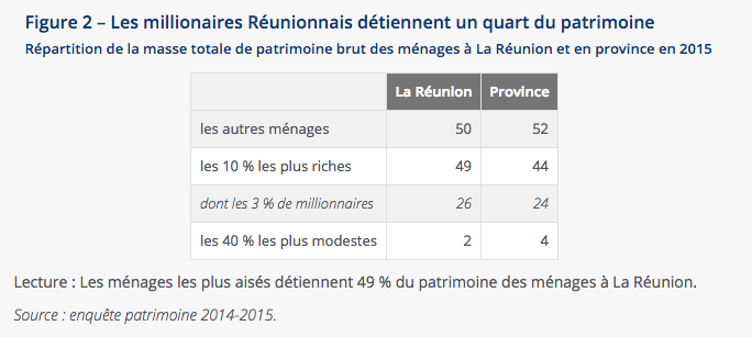 À La Réunion, 9 000 ménages sont millionnaires. Ils détiennent 26 % du patrimoine, alors qu’ils ne représentent que 3 % des ménages.