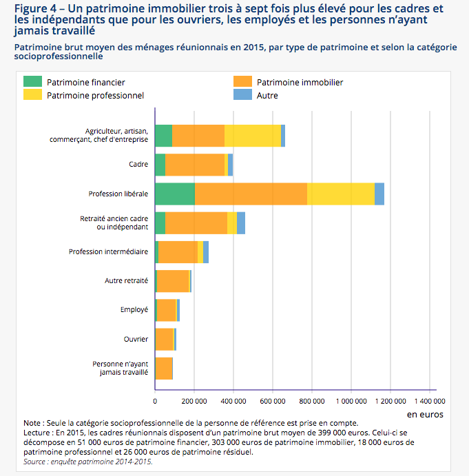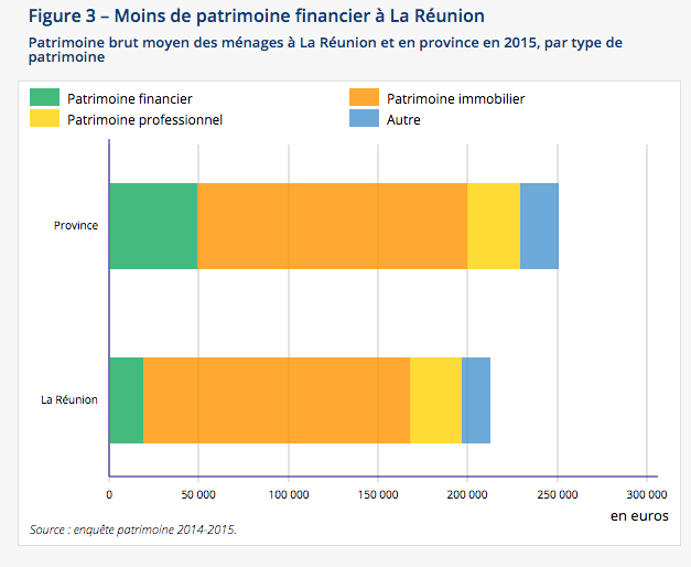 En moyenne, les ménages réunionnais possèdent 212 000 euros de patrimoine contre 250 000 euros en province. Cet écart s’explique d’une part par les caractéristiques socio-démographiques de la population réunionnaise. Ainsi, 54 % des ménages sont des ménages d’ouvriers, employés ou de personnes n’ayant jamais travaillé, contre 32 % en province. En outre, la population y est plus jeune ; or le patrimoine augmente avec l’âge.
