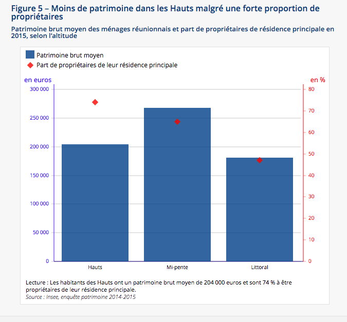 De plus, les habitants à mi-pente possèdent des patrimoines financier et professionnel plus élevés que dans les Hauts ou sur le littoral, du fait qu’ils sont plus souvent en emploi et ont ainsi des revenus plus importants.