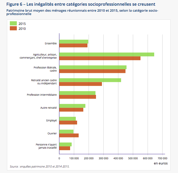 En revanche, les inégalités entre certaines catégories socioprofessionnelles se sont creusées (figure 6). Ainsi, le patrimoine des agriculteurs, des artisans, des commerçants et des chefs d’entreprise a augmenté entre 2010 et 2015. C’est aussi le cas pour les retraités d’une profession de cadre ou d’indépendant. En revanche, le patrimoine a diminué chez les ouvriers. En effet, ces derniers sont moins souvent propriétaires qu’en 2010. Le patrimoine des autres catégories de travailleurs et de retraités est quant à lui resté stable.