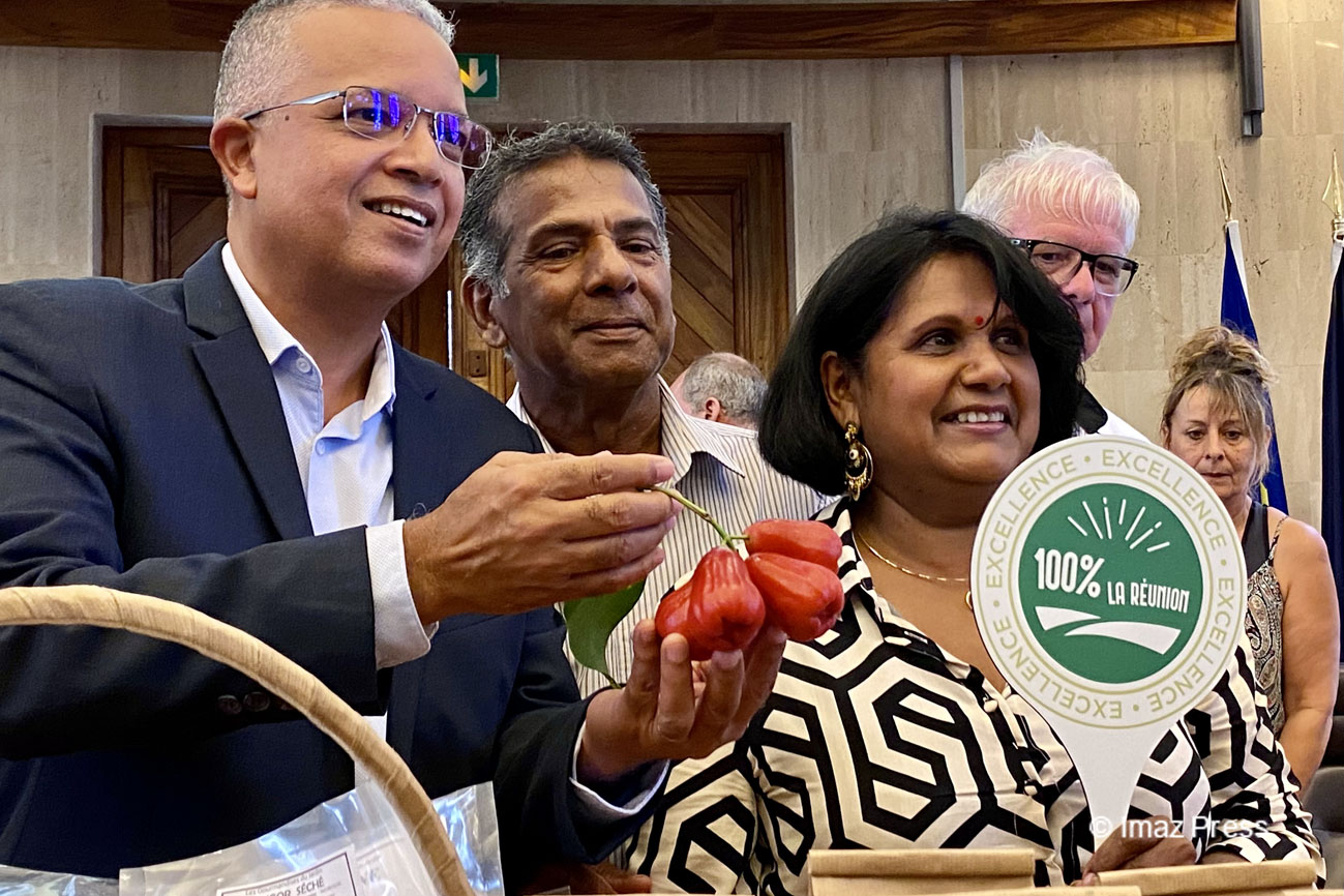 Ce mercredi 8 février 2023, le Département a fait la présentation et le lancement officiel de la marque "100 % La Réunion". Elle vient mettre en valeur les produits issus de l’agriculture et de la production 100 % péi et donc entièrement réunionnaise. Le label compte déjà une quarantaine d’adhérents. (Photo : ef/www.imazpress.com)