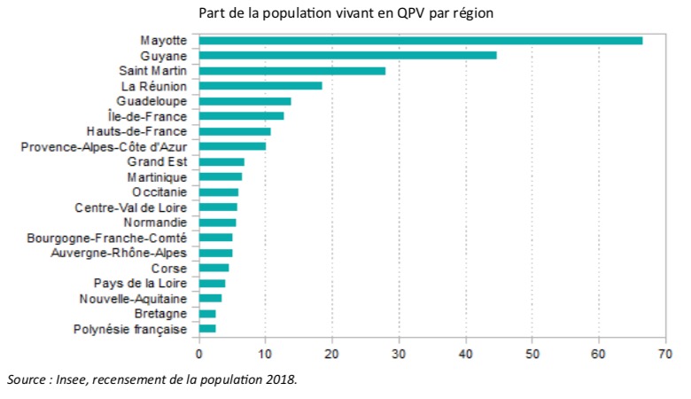 La part de la population vivant en QPV varie de 3 % en Bretagne à 12 % en Île-de-France pour la France métropolitaine et de 6 % en Martinique à 66 % à Mayotte , en passant par 19 % à La Réunion, pour les départements d’outre-mer. À La Réunion, c’est à Saint-Denis qu’on compte le plus grand nombre d’habitants en QPV (34 300 personnes). Mais c’est au Port (75 % de la population vivant en QPV), à Saint-Louis (34%) et à Saint-Benoît (32%) que la part de la population vivant en QPV est la plus élevée. À Mayotte, la part de la population vivant en QPV dépasse 90 % à Acoua, M’Tsangamouji, Ouangani, et Tsingoni.