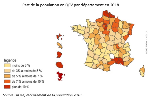 Les départements du Nord, du Pas-de-Calais et du Territoire de Belfort dans le quart nord-est de la France, les départements franciliens du Val de Marne, de l’Essonne, du Val d’Oise et de la Seine-Saint Denis et les départements du sud-est (Bouches du Rhône, Vaucluse et Gard) ont plus de 10 % de leur population vivant dans un QPV. La Lozère est le seul département français sans QPV. Entre 2013 et 2018, la part de la population résidant en QPV dans chaque département a peu varié. Elle a toutefois augmenté de 2 points en Guyane et diminué d’autant dans le Territoire de Belfort. (Voir la carte ci-dessous).