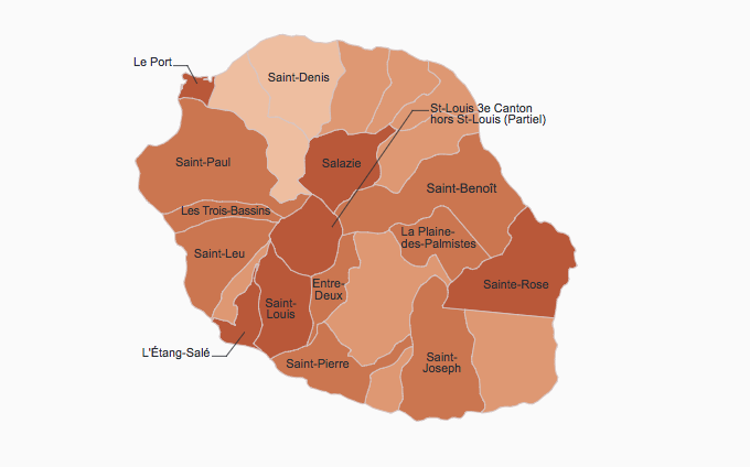 Finalement, ce sont les jeunes vivant dans "les zones urbaines et périurbaines de Saint-Denis ou encore de Saint-Louis (hors 3e canton)" qui cumulent le moins de handicaps. Dans ces espaces résidentiels, la part des chômeurs parmi les 15-64 ans est la plus faible de l’île. Du coup, la part des jeunes non diplômés parmi les 15-24 ans non scolarisés est également la plus faible de l’île, de 34% à 37% (34 % à La Possession, 34,7 % à Saint-Denis), à l’exception de L’Étang-Salé (47,4 %).