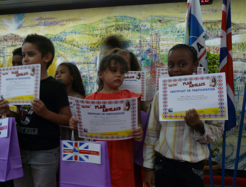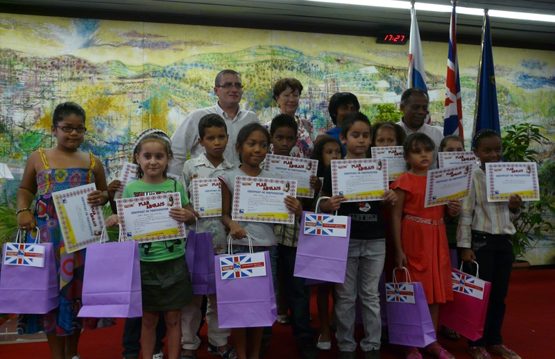 Mise en place en 2008 par la ville de Saint-Denis, dans le cadre de son projet éducatif global, le plan Anglais vise à développer la pratique de la langue de Skakespeare au sein des écoles dionysiennes.Apprentissage des couleurs, des mois, des chiffres ou encore des fruits... Les 355 marmailles récompensés ce mercredi et premiers à avoir pu bénéficier du Plan Anglais ont suivi, avec assiduité, des leçons d'anglais depuis 3 ans, de la grande section de maternelle au CE1. Des cours dispensés par 85 étudiants réunionnais et 18 étudiants étrangers, durant la pause méridienne, à hauteur d'une heure par semaine, aux enfants qui le souhaitent.