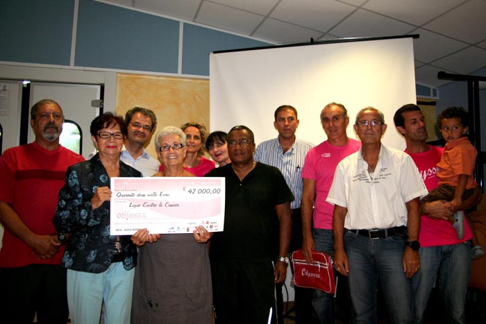 L'association Odyssea a remis à la Ligue contre le Cancer (comité réunionnais) un chèque de 42 000 euros ce jeudi 15 mars 2012. Ces fonds sont utilisés à la Réunion pour améliorer le confort des malades les plus démunis face à la maladie, notamment en permettant l'achat de produits de soins, de prothèses, ou par le financement d'opérations de reconstruction. La cérémonie s'est déroulée à la Cuisine Centrale de l'Etang-Salé, commune qui accueille depuis 4 années déjà la course Odyssea avec un succès grandissant.