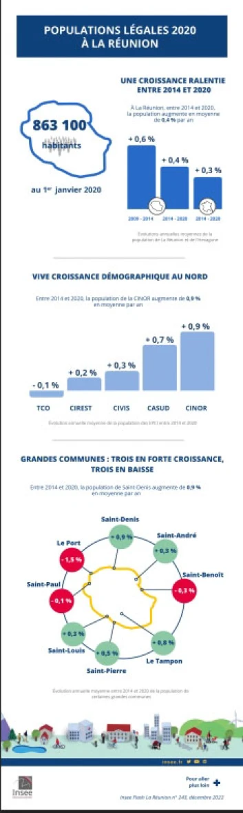 Elle baisse en revanche légèrement à Saint-Paul et Saint-Benoît, et fortement au Port. Au 1er janvier 2020, 863 083 habitants vivent à La Réunion, soit 1,3 % de la population française.