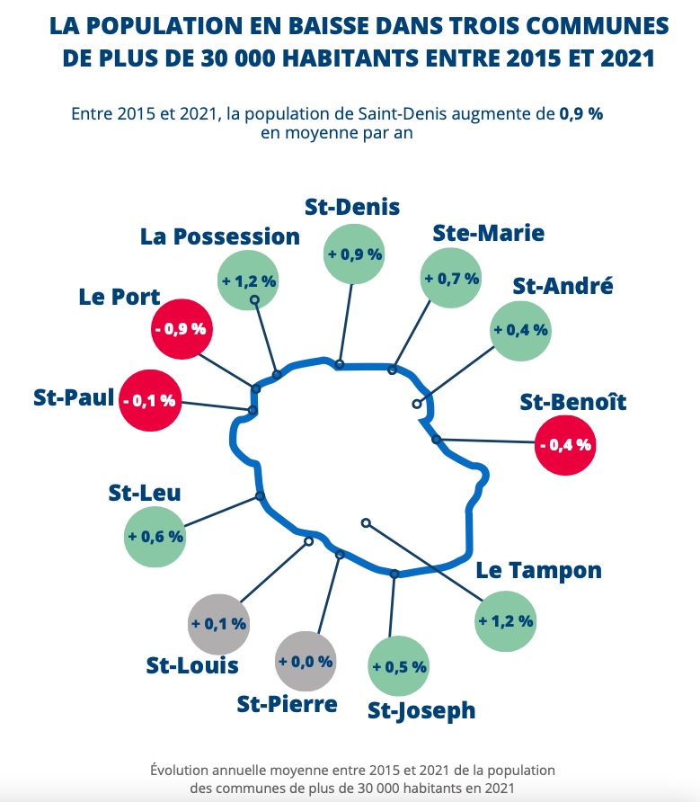 Au sein des plus grandes villes réunionnaises, entre 2015 et 2021, la population est la plus dynamique au Tampon, à La Possession et à Saint-Denis. Elle est stable à Saint-Pierre et à Saint-Louis, tandis qu’elle baisse à Saint-Paul, à Saint-Benoît et au Port.