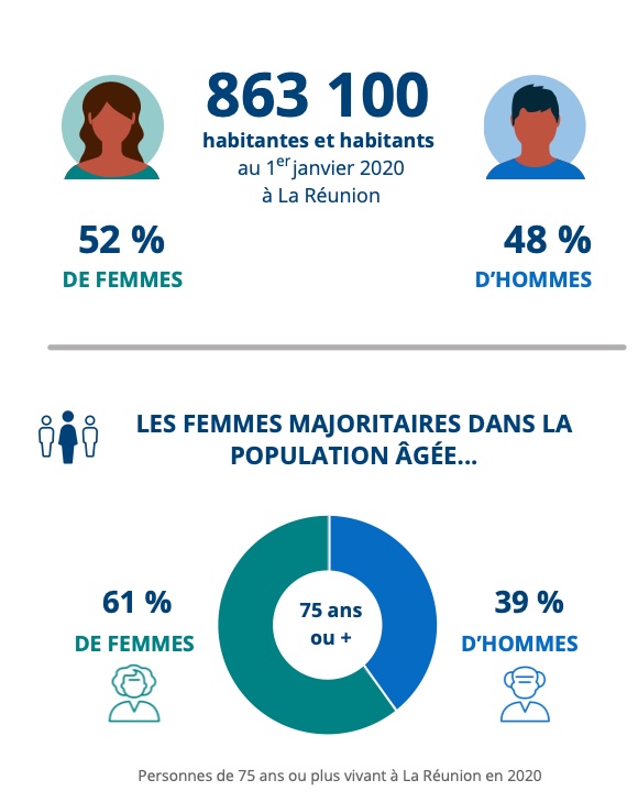 À La Réunion comme ailleurs, à âge égal, elles se déclarent en moins bonne santé que les hommes. Néanmoins, les femmes vivent plus longtemps qu’eux.