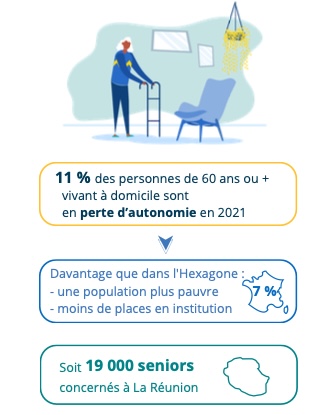 À La Réunion, la perte d’autonomie à domicile est plus élevée que dans l’Hexagone, alors même que les seniors réunionnais sont plus jeunes. L’âge des seniors vivant à leur domicile est de 70 ans en moyenne contre 72 ans dans l’Hexagone. Or, la perte d’autonomie à domicile augmente rapidement avec l’âge.