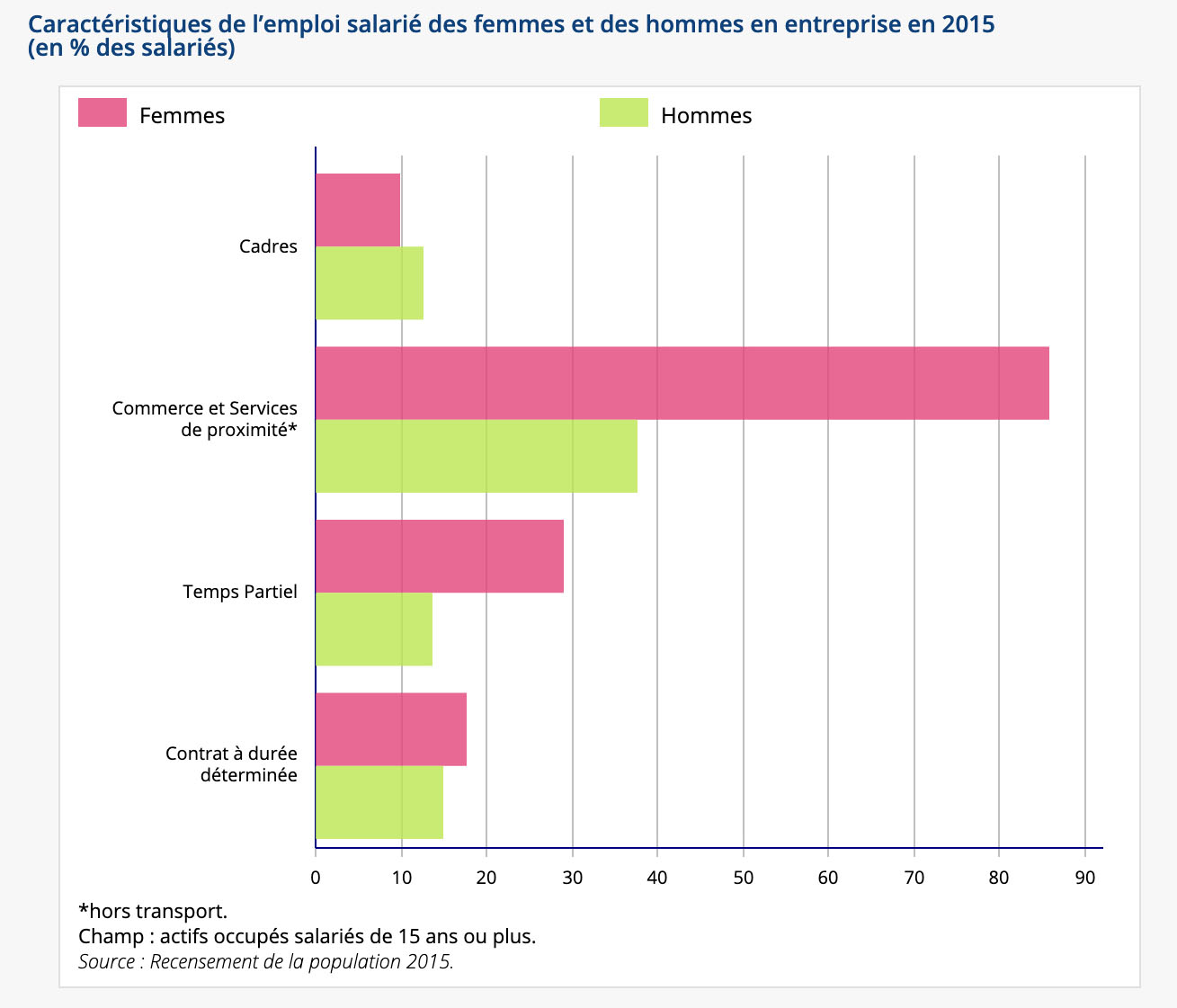- Un revenu salarial inférieur à celui des hommes, en lien avec des emplois plus précaires -