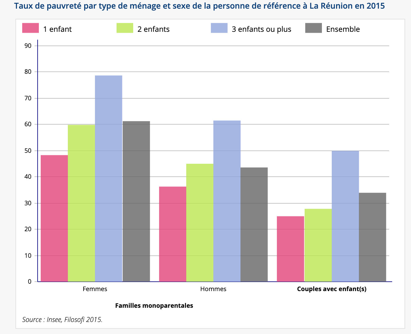 Les femmes vivant seules avec leurs enfants sont plus souvent pauvres : 61 % vivent sous le seuil de pauvreté à La Réunion en 2015, contre 44 % des hommes en familles monoparentales et 34 % des couples avec enfants (figure 2). Plus le nombre d’enfants est élevé, plus le taux de pauvreté est important : il culmine à 79 % pour les mères seules avec trois enfants ou plus.