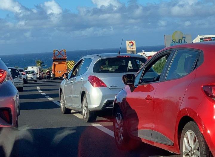 Un accident impliquant deux véhicules a eu lieu dans la matinée à Saint-Pierre, au niveau de la ZI numéro 3 dans le sens nord-sud. Ce carambolage a entraîné plus de 13 km de bouchons dans la matinée, dès le Gouffre à l'Etang-Salé. A 8h45 l'accident était terminé, et la circulation recommence à se fluidifier. A 10h, on ne compte plus que 2-3 km d'embouteillages, à partir du Gol (Photo : Charlene Tdr / radar 974)