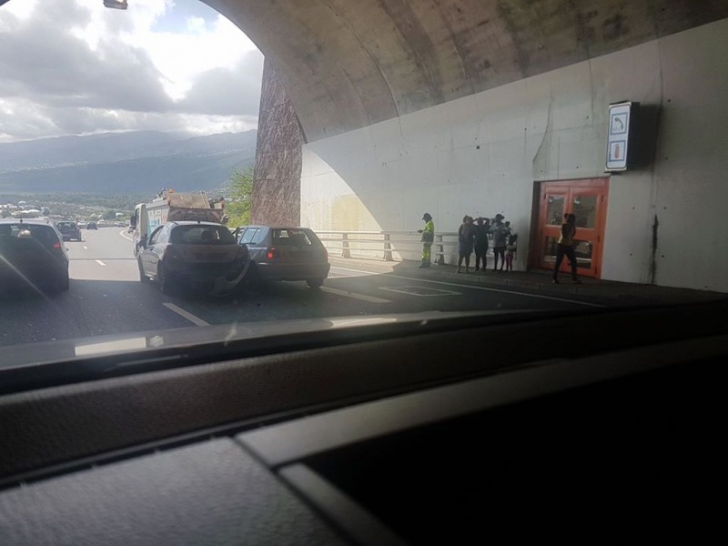 Ce vendredi 27 avril 2018, un accident s'est produit à la sortie du tunnel de Saint-Paul sur la route des Tamarins en direction du Nord. Plusieurs kilomètres d'embouteillages se sont formés. Les ralentissements remontent depuis le Cap La Houssaye. (Photo : Radar 974)