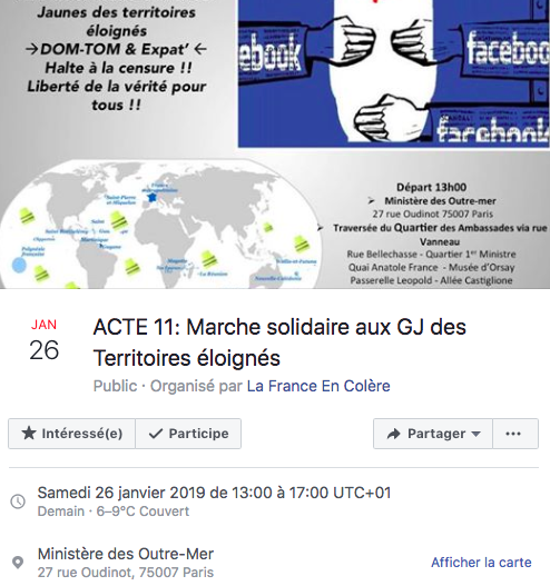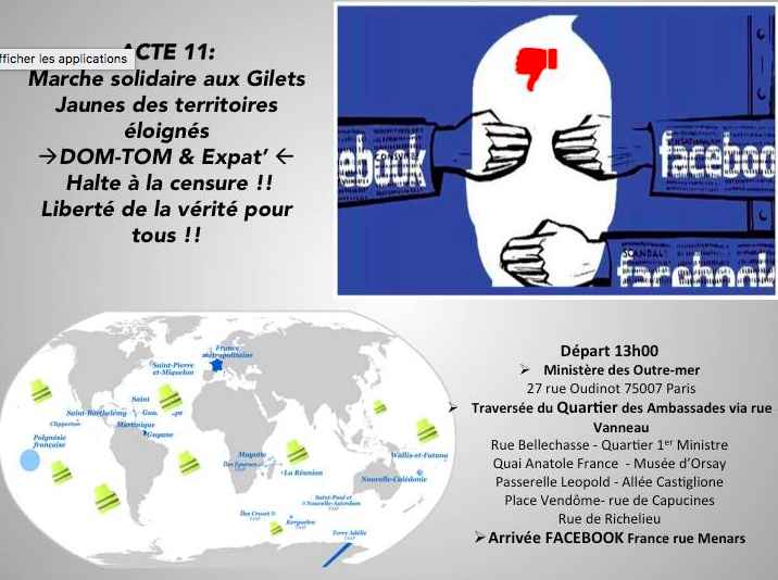 Le cortège partira, symboliquement, du ministère des Outre-mer à Paris dans le 7ème arrondissement rue Oudinot à 13h et se terminera devant le siège de Facebook France rue Ménars dans le 2ème arrondissement.