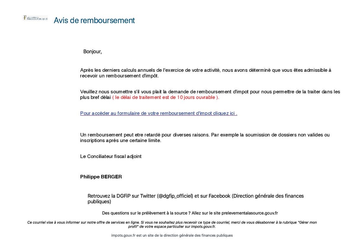 La Chambre d'agriculture informe ses ressortissants et l'ensemble du monde agricole de l'existence de mails frauduleux estampillé "Finances Publiques" et intitulé "Avis de remboursement" qui circulent actuellement à destination des exploitants agricoles. Attention document est un faux et relève de l'arnaque, souligne la Chambre verte