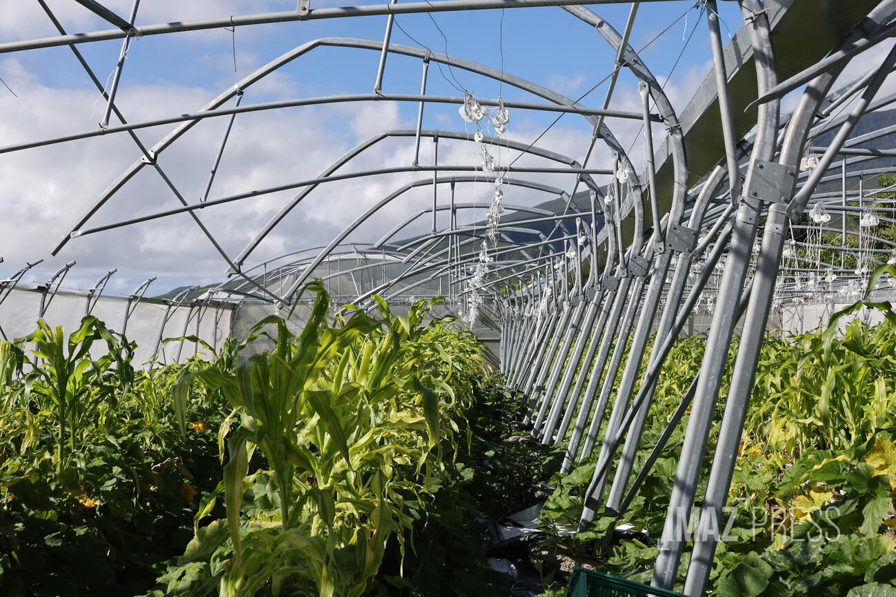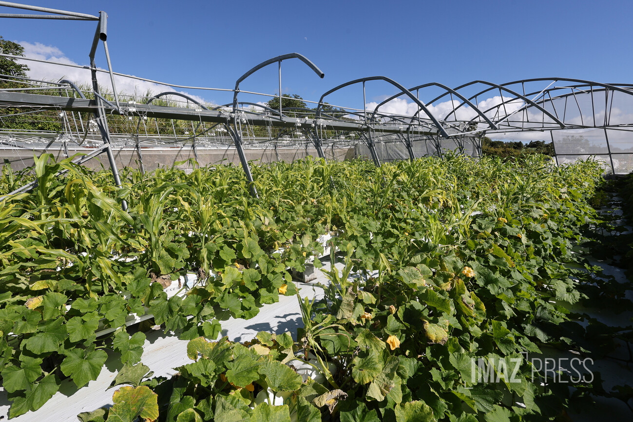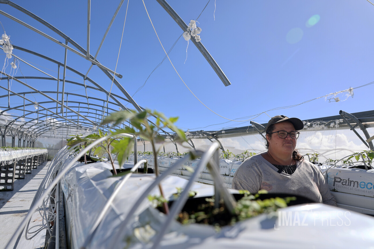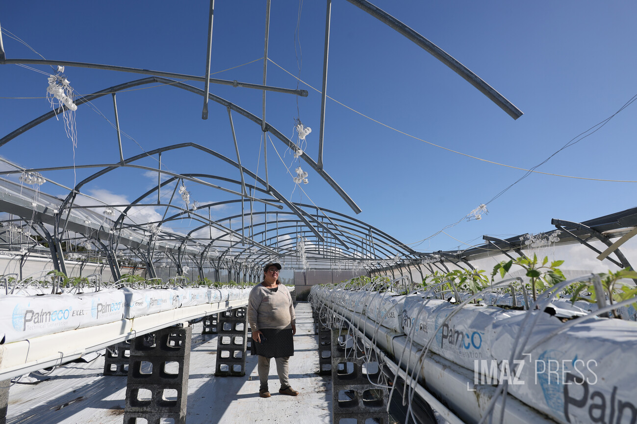 Derrière elles, c'est un paysage de désolation qui nous fait face : les quatre serres de l'exploitation tiennent à peine debout. Détruites par Garance en février dernier, les structures métalliques abritent quelques pieds de tomates et courge butternut, replantés après le cyclone dans l'espoir de faire repartir la production.