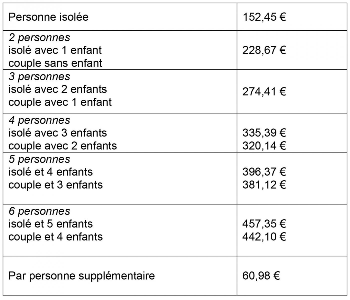 Les montants variables selon la taille de famille sont les suivants :