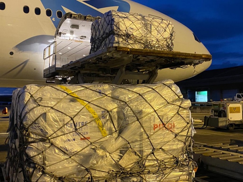 Air Austral transporte pour l'occasion 45 tonnes de fret humanitaire, principalement composé de 2 000 kits d'abris d'urgence et 4 000 bâches pour la construction du camp.