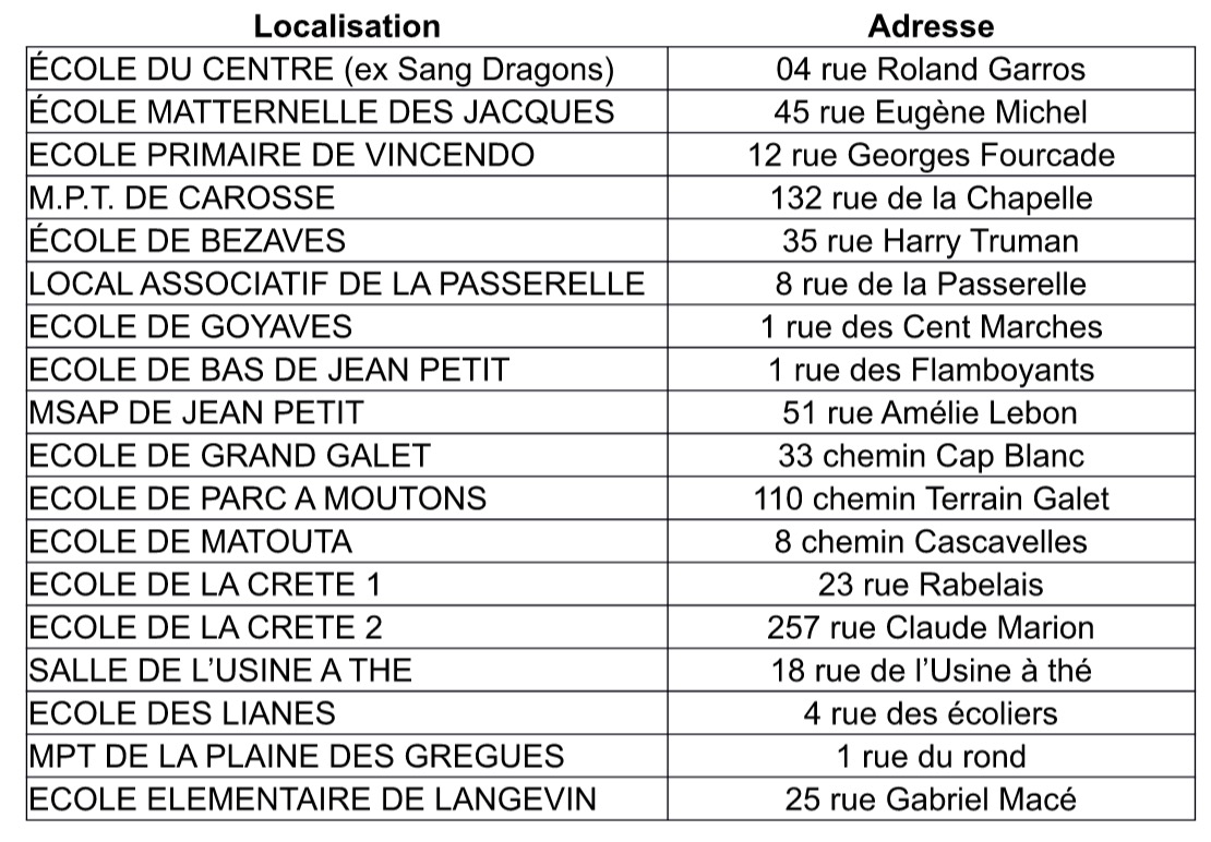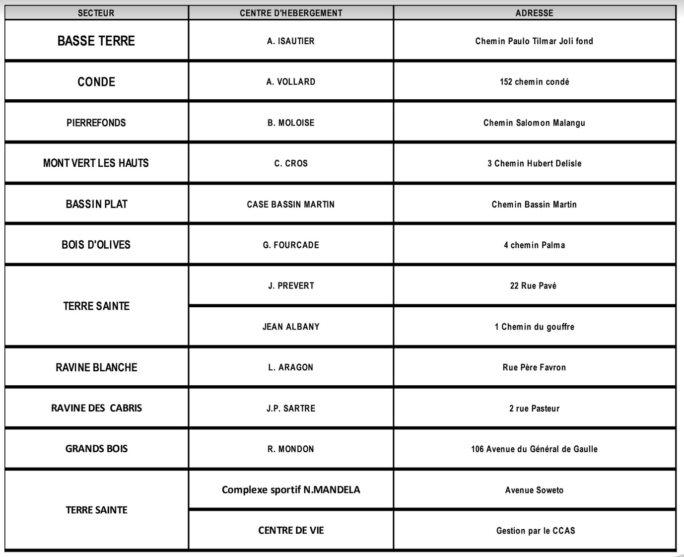 La mairie communique la liste des centres d'hébergement d'urgence de la Ville. Ils seront ouverts en cas de nécessité, après déclenchement de l'alerte rouge. Le numéro de téléphone unique à composer concernant les centres et les interventions techniques est celui du PC ORSEC : 0262 35 87 00.