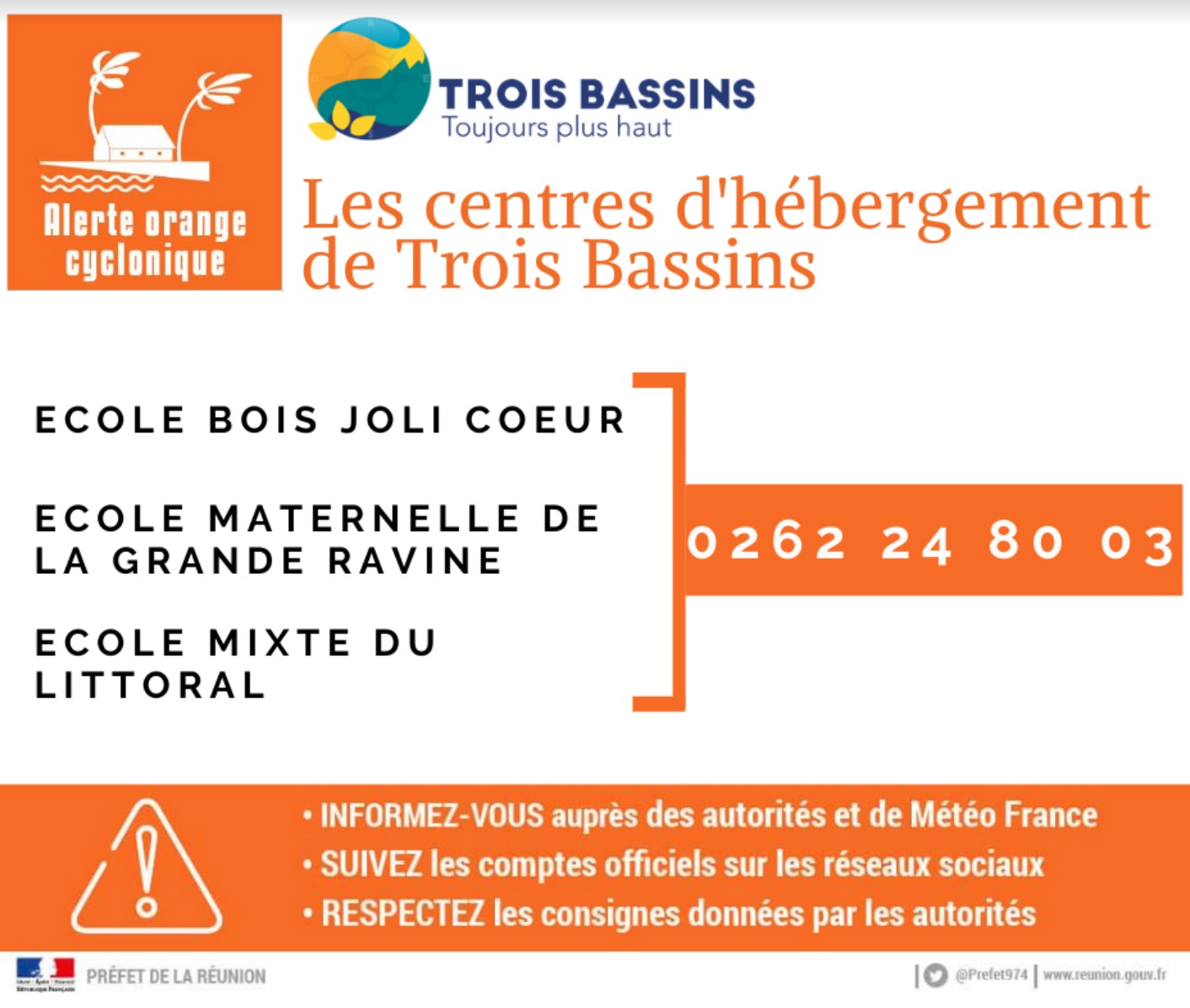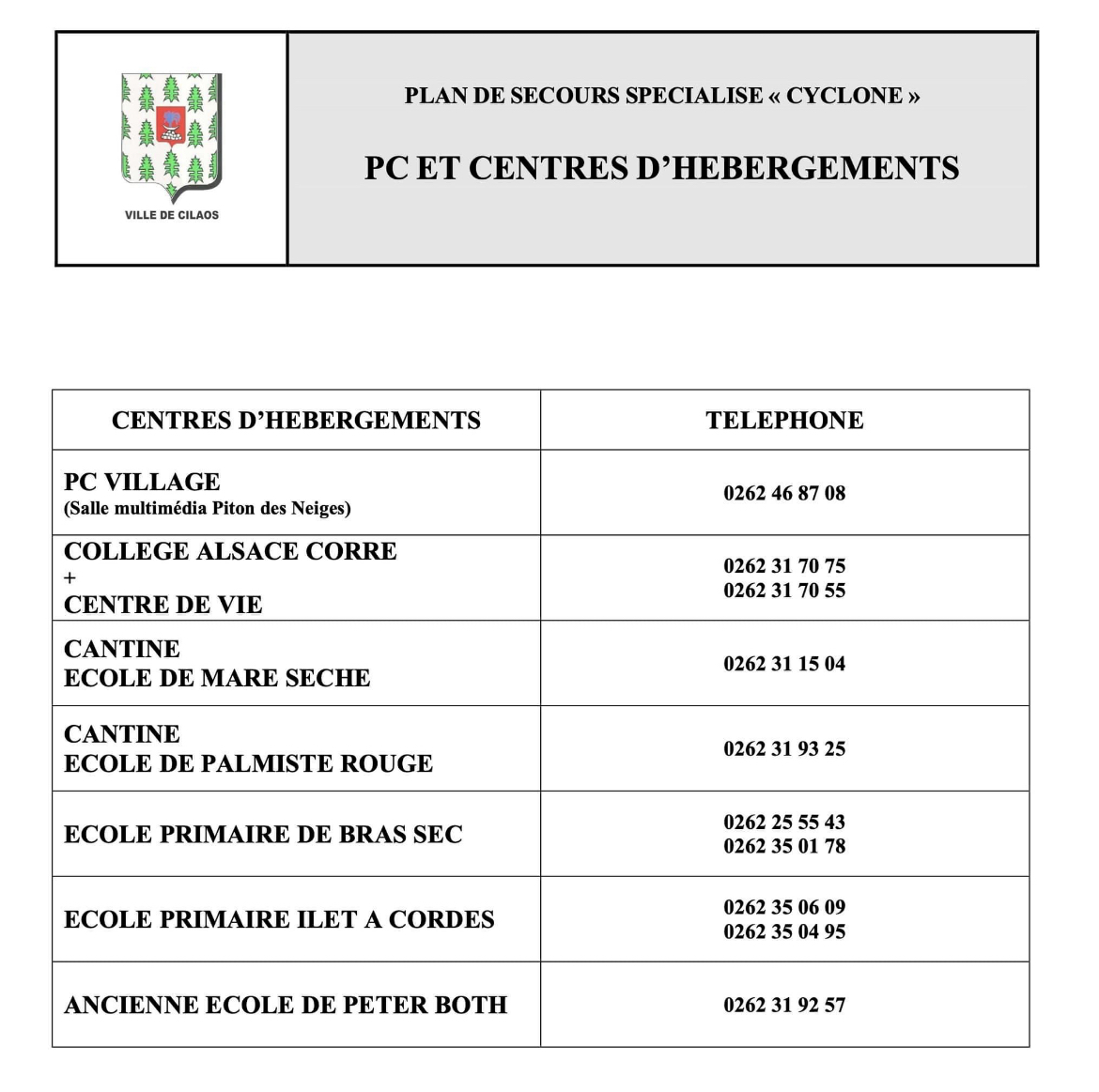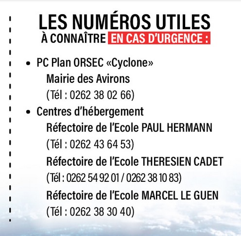 Pour rappel, une fois ouverts, les centres d'hébergement seront joignables via le standard de l'Hôtel de Ville au 0262 33 43 33. Numéros de téléphones utiles : SAMU 15, Pompiers 18, Police et Gendarmerie 17.