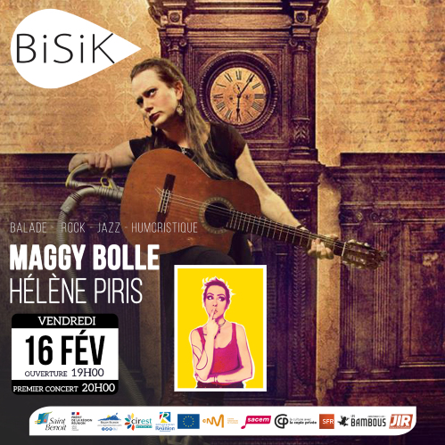 - Du côté du Bisik, ce soir c’est chanson française avec d’un côté Hélène Piris qui à travers son nouvel album “Non mais on va s’en sortir”, nous dévoile une nouvelle facette d’elle-même ; et de l’autre Maggy Bolle et ses titres empreints de tendresse, d’amour et de bons sentiments, le tout saupoudré de franchise, de règlements de comptes, de coups de gueule et de mises au point salutaires.