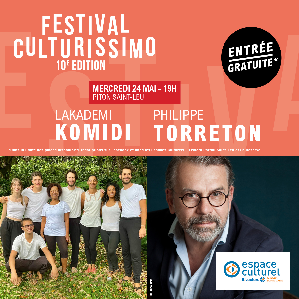 Le Festival Culturissimo c’est quoi ? Une rencontre avec des comédiens locaux : cette année, Lakadémi Komidi présentera la BD récompensée aux Prix Flamboyant “5 Réunionnaises, 5 destins”. Une rencontre avec l’acteur Philippe Torreton qui lira son livre « Lettre à un jeune comédien ». La soirée se terminera autour d'un buffet convivial.