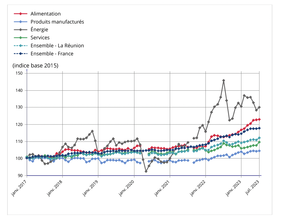 Les prix à la consommation augmentent de 1,1 % en juillet 2023 à La Réunion. En juillet, la hausse des prix concerne tous les secteurs de consommation.