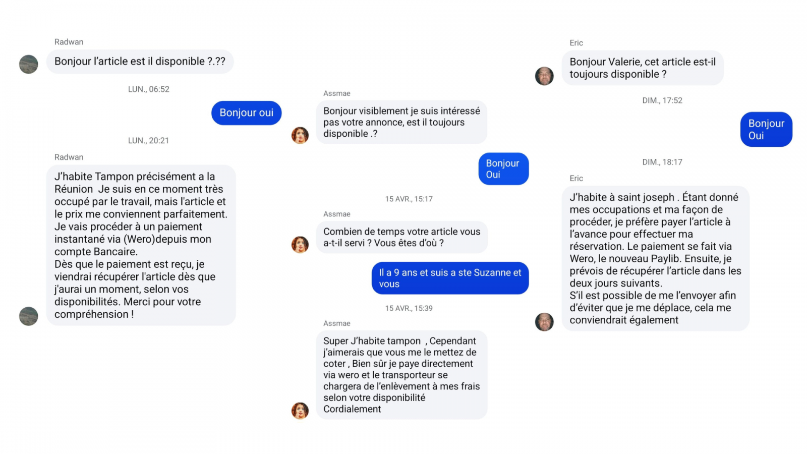 Suite à une annonce publiée il y a 2 ans et tjrs d’actualité pour un drone à 800€, la personne a d’abord demandé via la messagerie du site si l’article était dispo et qu’il le prenait sans même me parler des démarches envers la DGSA et me propose wero. Je lui ai répondu dans un premier temps par mail disant que je ne connaissais pas Wero et que je préfére paypal, puis par SMS pour lui donner les photos de l’appareil, lui dire que je veux passer par Mondial relay, qu’il doit me donner un point de relay et lui dit de patienter après le week-end pour régler le temps que je trouve un carton.
