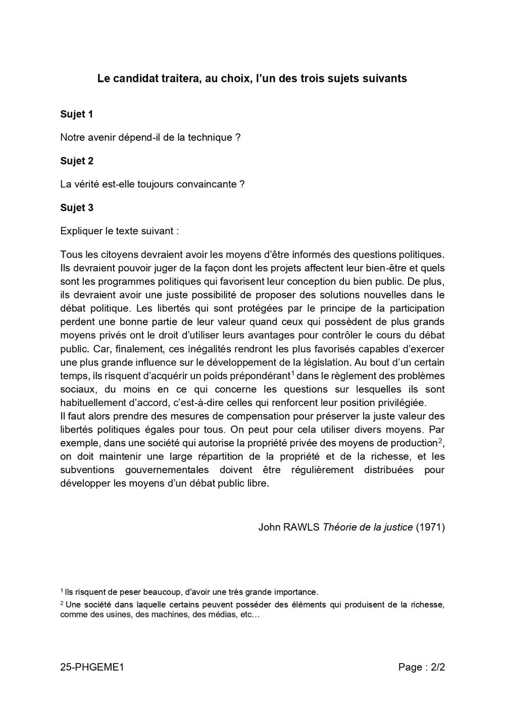 Pour la filière générale, les sujets sont pour la dissertation (au choix) : "Notre avenir dépend-il de la technique ?" ou "La vérité est-elle toujours convaincante ?". Un extrait de La théorie de la justice de John Rawls, de 1971, est proposé pour l'explication de texte.