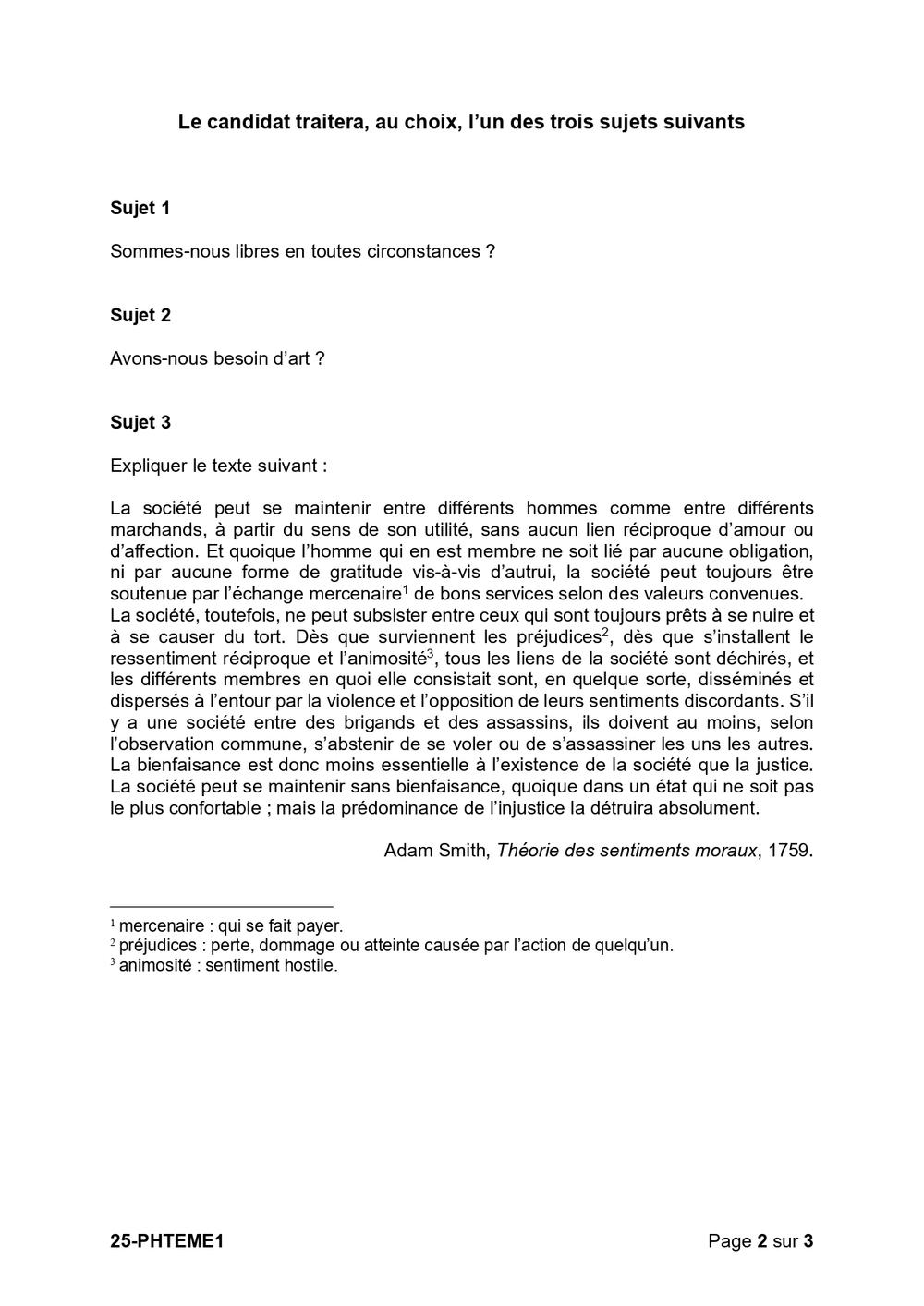 Pour la filière technologique, les sujets sont, pour la dissertation : "Sommes-nous libres en toutes circonstances ?" ou "Avons-nous besoin d'art ?". Pour l'explication de texte, un extrait de Théorie des sentiments moraux d'Adam Smith, de 1759, a été choisi.