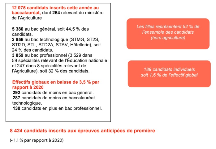 12.075 candidats inscrits cette année au baccalauréat, dont 264 relevant du ministère de l'Agriculture, annonce le rectorat, alors que les épreuves du bac démarrent le 17 juin. Le rectorat qui indique également que 5.380 sont inscrits au bac général, soit 44,5 % des candidats, 2.856 au bac technologique soit 24 % des candidats, et 3.859 au bac professionnel soit 32 % des candidats. Des effectifs globaux en baisse de 3,5 % par rapport à 2020. Les élèves filles représentent 52 % de l'ensemble des candidats (hors agriculture). Par ailleurs, 8.424 candidats sont inscrits aux épreuves anticipées de première. Nous publions ci-dessous le communiqué du rectorat (Photo d'illustration rb/www.ipreunion.com)