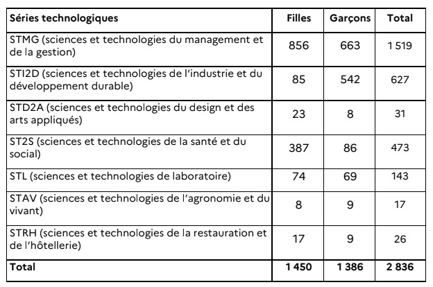 2 856 inscrits en séries technologiques à la session 2021 (3 123 en 2020 et 3 165 en 2019), dont 51 % de filles (on comptait 50 % de filles en 2020). La diminution du nombre de candidats au bac technologique par rapport à la session 2020 (- 247) est due à la baisse des inscrits dans les séries : STI2D (-98,. STMG (-85), ST2S (-59), STL (-35), STAV (- 10), STRH -1). Une seule série est en légère augmentation : STD2A (+1).