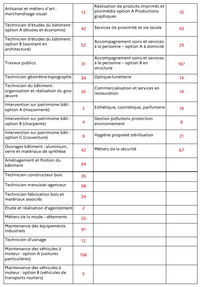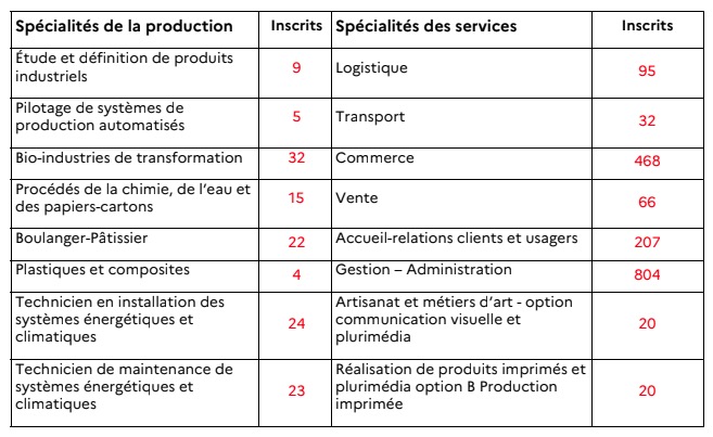 3 859 inscrits en bac professionnel, dont 3 612 inscrits dans 60 spécialités de l’éducation nationale et 247 inscrits dans 8 spécialités relevant de l’agriculture.