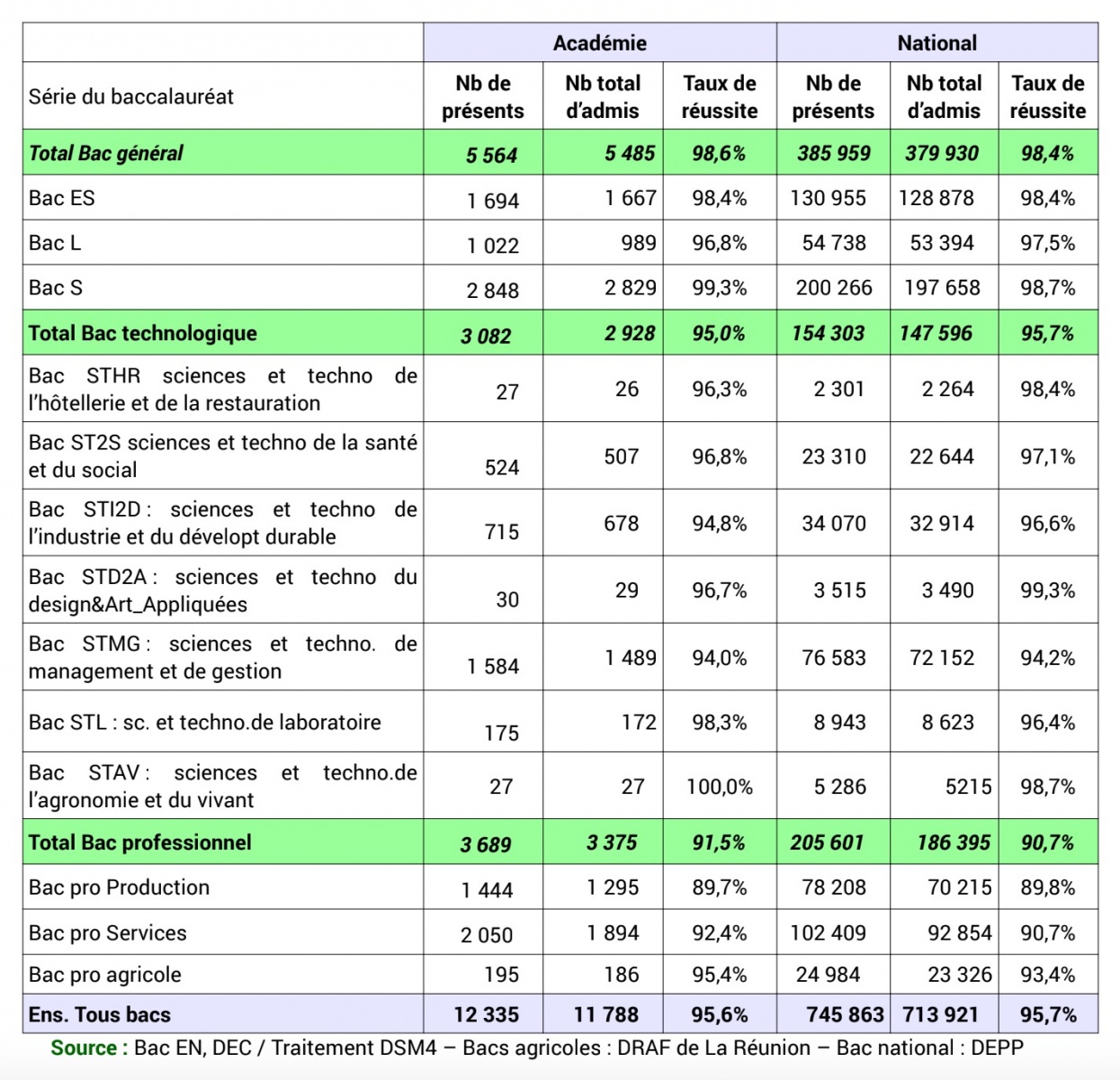À l’issue des épreuves du premier groupe, le taux d’admission globale pour l’académie de La Réunion était de 90,1 %. Après les épreuves de second groupe (rattrapage), ce taux atteint 95,6%, permettant ainsi à 11 788 candidats de devenir bacheliers.