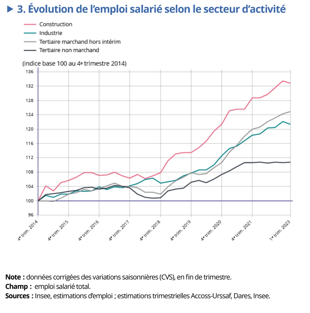 Au 1er trimestre 2023, dans les services aux entreprises, 300 emplois sont créés comme au trimestre précédent. Dans les transports, l’emploi salarié hors intérim continue d’augmenter ce trimestre : +200 emplois après +300 emplois au trimestre dernier. Dans les secteurs de l’hébergement-restauration, les créations d’emploi ralentissent (+100 emplois créés contre +200 au trimestre précédent). Dans le commerce, l’emploi salarié hors intérim est stable ce trimestre contrairement à fin 2022 où 200 emplois avaient été créés.