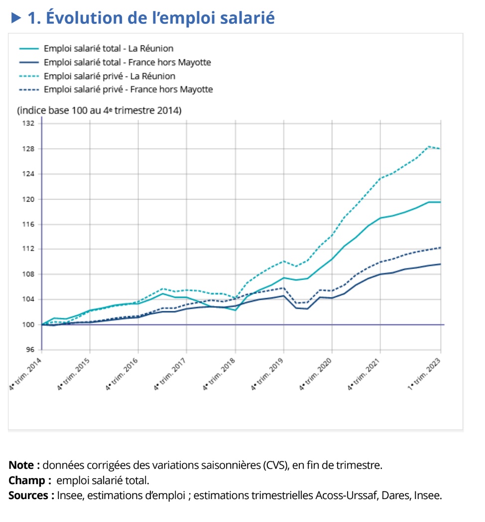 Fin mars 2023, 290 800 salariés et salariées travaillent à La Réunion, secteurs privé et public confondus. Pour la première fois depuis le 1er trimestre 2020, l’emploi salarié diminue légèrement (-200 emplois, soit -0,1 %) - figure 1. Cela fait suite à une année 2022 où l’emploi avait augmenté de manière dynamique mais moins fortement qu’en 2021. Au niveau national, l’emploi continue d’augmenter ce trimestre. Cependant, sur un an, la croissance de l’emploi salarié reste plus élevée à La Réunion qu’au niveau national : +1,8 % contre +0,3 % entre mars 2022 et mars 2023. Le dynamisme des contrats d’apprentissage explique plus d’un quart de cette hausse annuelle.