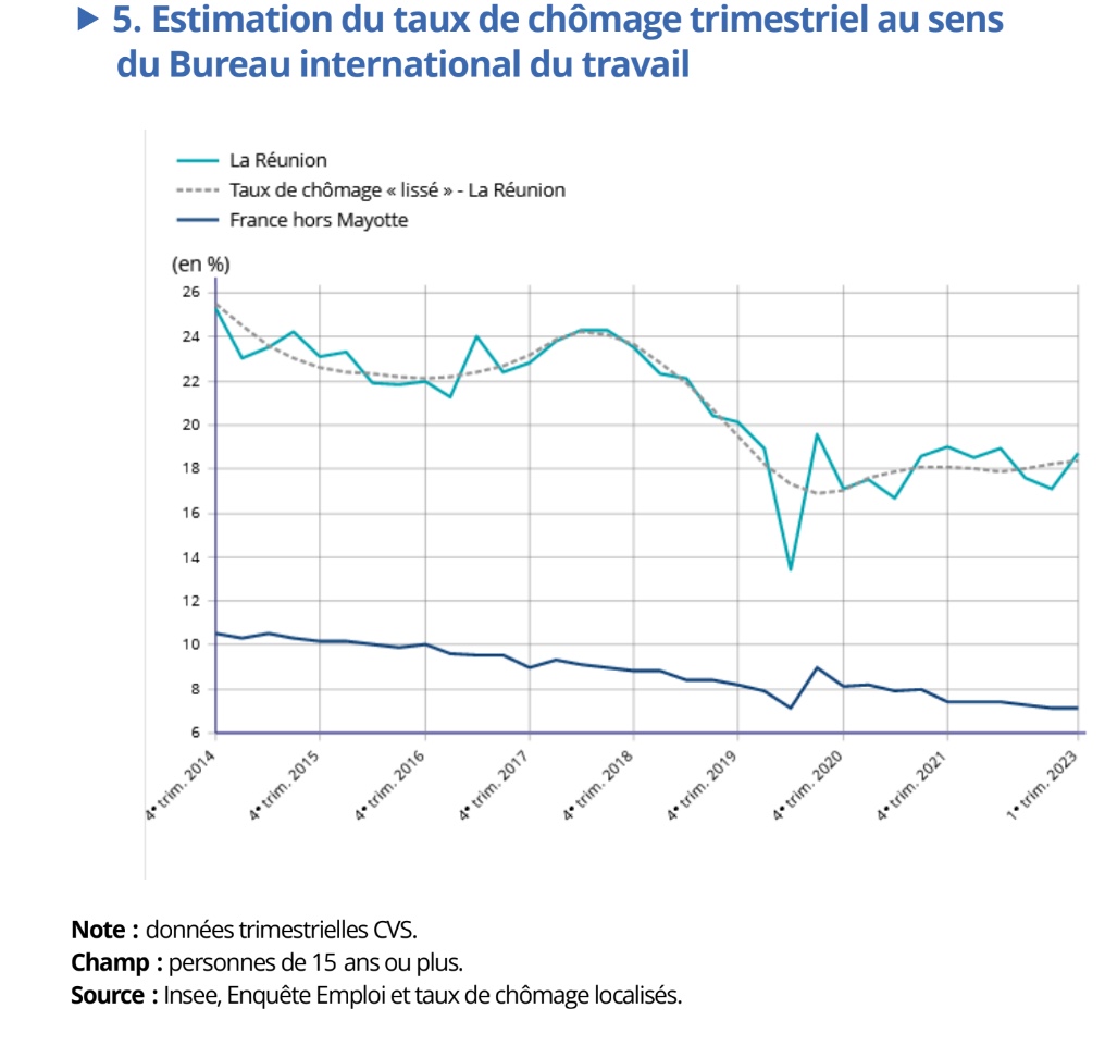 À La Réunion, au 1er trimestre 2023, le taux de chômage au sens du Bureau international du travail (BIT) s’établit en moyenne à 19 % de la population active. Depuis deux ans, le chômage est quasi stable : il oscille entre 17 et 19 %, à un niveau bien en deçà de sa valeur de fin 2018 (24 %) - figure 5. La baisse du chômage depuis 2018 est à relier au fort dynamisme de l'emploi des années 2021 et 2022. Au niveau national, le chômage concerne 7,1 % de la population active au 1er trimestre 2023.