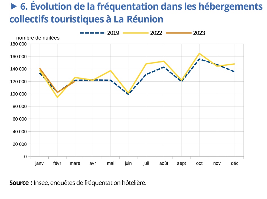 Avec 363 600 nuitées enregistrées au 1 er trimestre 2023, la fréquentation touristique dans les hôtels et autres hébergements collectifs touristiques continue de progresser. Elle se situe au-dessus de son niveau d’avant la crise sanitaire et augmente de 1,5 % par rapport au 1 er trimestre 2022. La hausse de la fréquentation est notamment plus marquée en février (+8,6 % par rapport à février 2022) - figure 6.