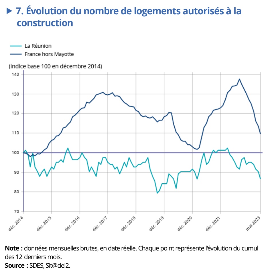 En un an, d’avril 2022 à mars 2023, 7 600 logements sont autorisés à la construction à La Réunion, soit 900 logements de moins par rapport à la même période un an auparavant (-11 %). Cette baisse concerne autant les permis pour les logements individuels (-10 %) que collectifs (-12 %) - figure 7. Au niveau national, la baisse est d’une ampleur comparable (- 11 %), mais ne concerne pas les logements collectifs (+3 %). À La Réunion, 6 100 logements sont mis en chantier entre avril 2022 et mars 2023, soit 1 200 de moins par rapport à la même période un an plus tôt (- 16 %). Au niveau national, les mises en chantier baissent également, mais de manière moindre (-10 %). À La Réunion comme en France, la baisse est plus marquée pour les logements collectifs que pour les logements individuels.