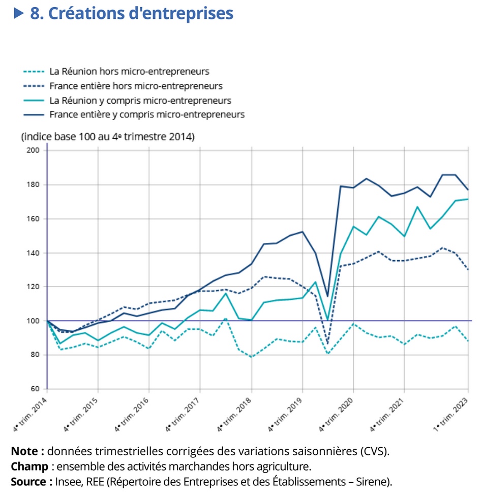 Au 1 er trimestre 2023, les créations d’entreprises individuelles sous le régime du micro-entrepreneur représentent 60 % des créations d’entreprises, une part un peu moins élevée qu’au niveau national (63 %). Ces créations augmentent à La Réunion par rapport au 4e trimestre 2022 (+8,5 %), tandis qu’elles reculent en France (-4 %). Quant aux créations d’entreprises hors entreprises individuelles sous le régime de micro-entrepreneur, elles reculent ce trimestre à la fois à La Réunion (-9 %) et en France (-7 %).